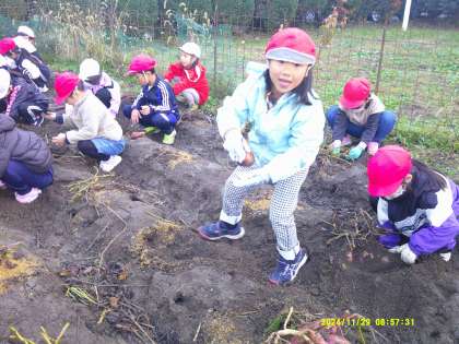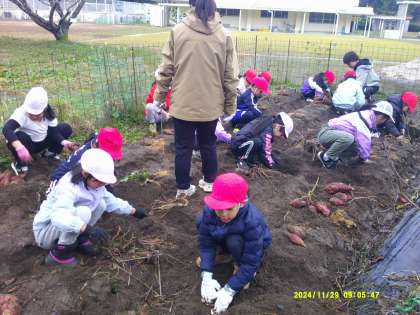 11月29日(金)学校で育てていたサツマイモを掘りました。軍手をはめて手作業でイモを掘ります。水やりなどの世話をしてきたので、いもほりを楽しみにしていました。たくさんの収穫に皆にっこにこでした。