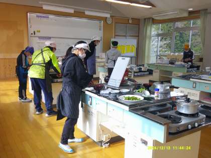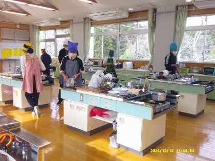 「まかせてね今日の食事」という単元の実習です。各自、栄養を考えて一食分の献立を作りました。今日は、自分で考えた汁物、主菜、副菜を実際に作りました。どのような順序で作っていけばよいのか、作るのに必要な調味料や調理器具は何か、などいろいろなことを考えながら作業していました。さて、出来栄えは?