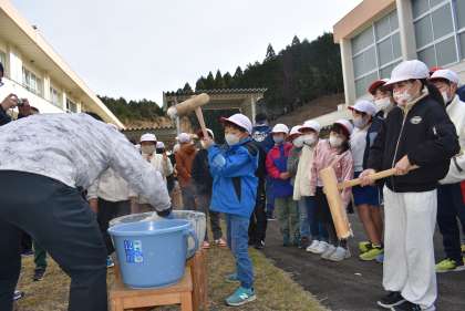杵を振り上げてもちをつくのは、なかなか大変です。もちつき体験を通して、日本の伝統文化への関心を高めたり、みんなで味わうことでお米の収穫に感謝したりすることが出来ました。出来上がったもちは、小さく丸めてきな粉もちにしていただきました。