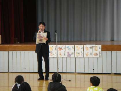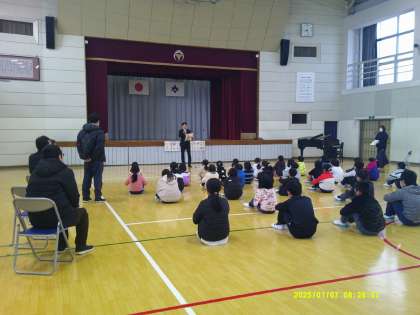 冬休みが明けて初めての7日、校長先生と新年の挨拶を交わした後、お話を聞きました。干支のお話で、巳年は「新しい自分に生まれ変わる」という意味があり躍進の年だというお話でした。子ども達は自分の新年の目標を思い浮かべていたのでしょうか、目を輝かせて聞いていました。