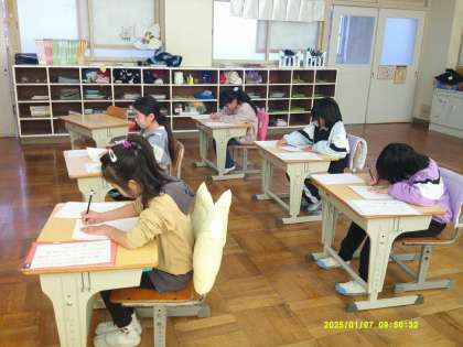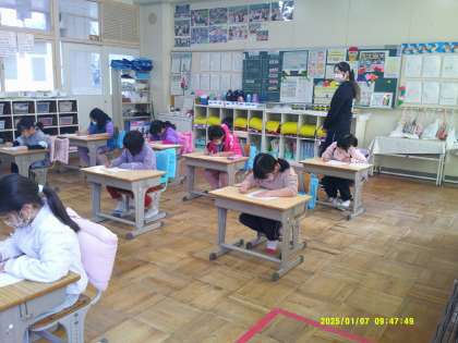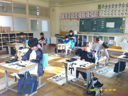 1月7日、2・3時間目に書き初め大会がありました。子ども達は冬休みにも家庭で練習をして大会に臨みました。1,2年生は硬筆、3年〜6年生は毛筆です。3年生は「山ざくら」と書きます。書く時の姿勢、鉛筆や筆の持ち方、紙を汚さないように、などいろいろなことに気を付けて清書していました。