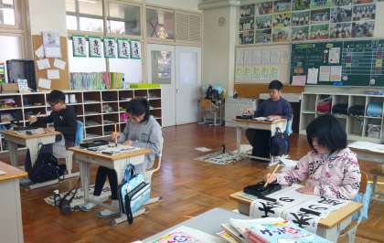 4年生は「明るい声」、5年生は「四季の風」、6年生は「満天の星」です。どの子も真剣に取り組んでいて、どの教室にもピリッとした緊張感が感じられました。指導された事をきちんと頭に入れて、お手本をよく見て…、思い通りに書くことが出来たでしょうか。作品は明日以降、教室の廊下側に掲示されます。