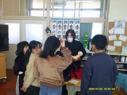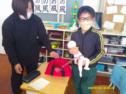 人の誕生とメダカの誕生とを比べながら、似ているところ、違うところを発表し合いました。どちらも初めは卵だったこと、受精してからどのように育っていくのか、などをまとめた後、実物大の人間の赤ちゃんの人形(胎盤付き)を見せてもらい、抱っこしたりして重さを確かめていました。