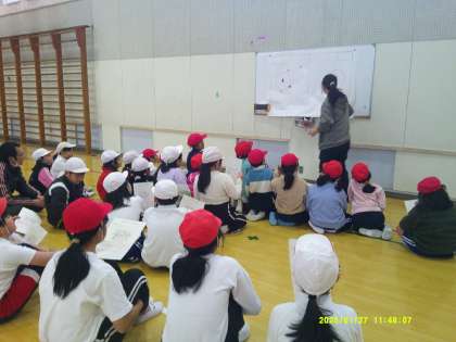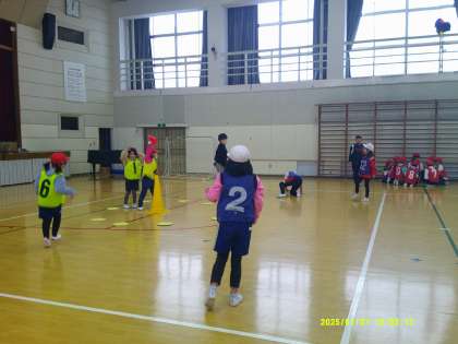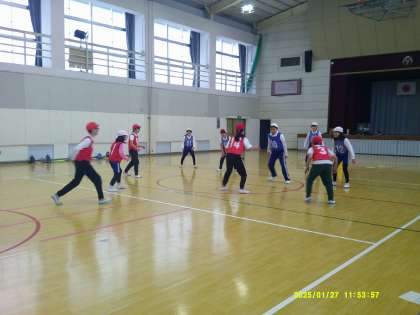 1月27日(月)、1,2,5,6年生の合同体育がありました。スポーツ鬼ごっこという競技の説明を聞いてから、チームに分かれて対戦しました。
