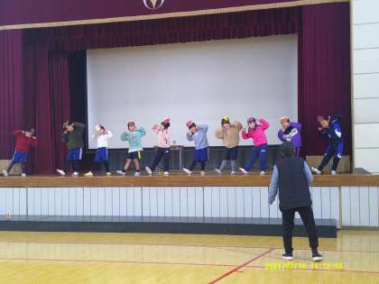 1年生の練習風景です。大きな声ではっきりと、動作は大きく、など観に来てくださった方々に伝わるように頑張って練習しています。是非、発表会にお越しいただき、子ども達に声援をお願いします。