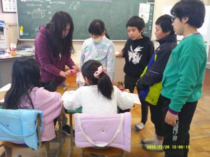 「直方体を切り開いた平面の図がかけるか」という学習です。直方体のどの辺が何センチになるのかを調べ、箱を切り開いて平面にして考えます。全員が平面図を描くことが出来ました。