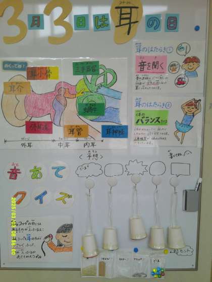 3月3日、今日は語呂合わせで「耳の日」です。耳の仕組みが分かりやすく説明されています。5つの紙コップの中に、ビー玉、米、クリップ、ストロー、つまようじがそれぞれ入れてあり、中が見えないようになっています。紙コップを耳元で振って、中身が何かを当てるクイズがあります。ビー玉はわかるのですが……。さて、全問正解できるかな。