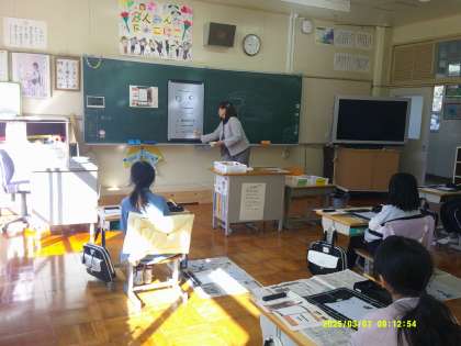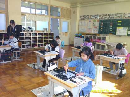3年生になると毛筆習字が始まります。来年度の学習にスムーズに入れるように、習字道具の使い方を学習しました。どの位置に何を置くか、筆をどのように持ったらよいかなど、先生の注意をうなずきながら聞いていました。筆を持つ腕に緊張が感じられます。今日は墨汁のかわりに水を使って、横画と縦画の練習をした後、「十」を書いてみました。