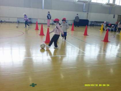 始めに、コーンを立てたコースをボールを蹴りながら回ってくる練習をしました。ボールと自分との位置関係や蹴る強さなどに気を付けながら何度も練習しました。