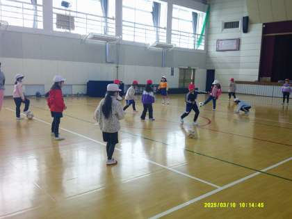 その後、たまご割りサッカーのゲームをしました。端から端までボールが通れば点が入ります。相手チームの子は中に入って、ボールを通さないようにカットします。作戦を考えてゲームに臨みました。