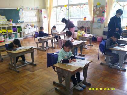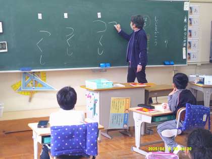その次に、ひらがなの練習です。「つくし」という文字の形や筆順を学習をしました。教科書の文字をなぞったり、黒板に書いてみたりして、何度も練習しました。線の長さや形、はらうのか止めるのか、などもしっかり教わりました。最後にはノートに「つくし」と上手に書けるようになりました。