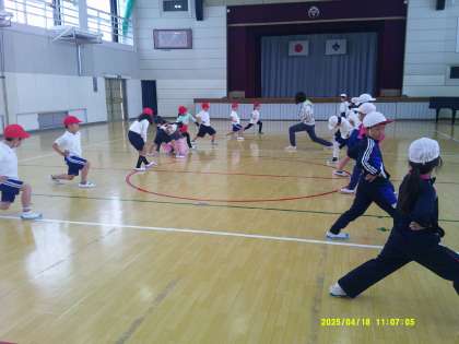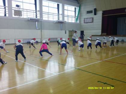 4/18 1,2年体育 公開日 2025/04/18 更新日 2025/04/18 お知らせ 🥰2年生が先輩としてがんばる!🥰 1,2年合同体育。3月まで1年生だった子ども達が、今度は2年生として新1年生の模範にならなくてはいけません。 体育館に移動する時の廊下での並び方、授業始めの整列の仕方、体操隊形への移動の仕方などを復習しました。昨年の準備運動やストレッチのやり方を思い出して1年生に伝えながら運動していました。