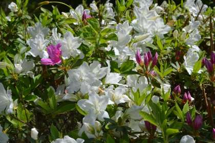 小原中部小学校の校庭では、5月初旬の爽やかな風とともに、色とりどりの植物が美しく咲き誇っています。校庭の隅には、鮮やかなツツジが咲き、ミツバチが忙しそうに飛び回っています。芝生の片隅には、イワニガナが可憐に咲いています。また、校庭の大きな木々は、青々とした葉を広げ、木陰を作ってくれます。
