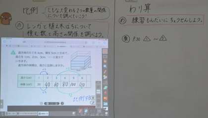 一方、5年生は「比例」の関係を探り、「数が増えるとどう変化するのか?」「比例のルールを見つけよう!」と、数学的な思考を深めていきました。