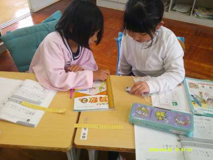 2人で協力して、物差しの目盛りの0と測る物の端を合わせて目盛りを読みます。全員が正しく測ることが出来ました。