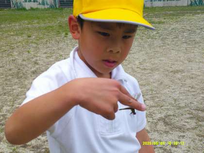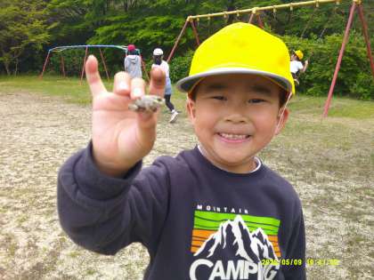 トンボやカエルを捕まえて、自慢げに見せてくれました。自然に恵まれた環境で、のびのび遊べるのがうれしいですね。