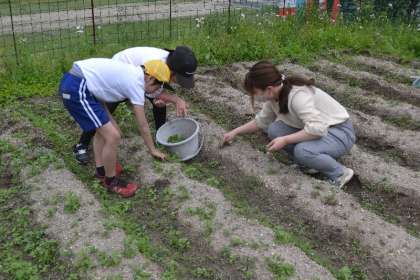 のびっこ学級の子どもたちが、夏野菜の栽培に向けて、校庭の畑の草取りを熱心に行いました。互いに協力しながら畑の準備を進める姿は、とても頼もしいものでした。
