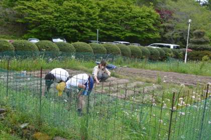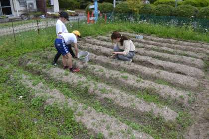 畑の草を丁寧に抜きながら、「ここにトマトを植えたいな」「きゅうりが大きく育つかな?」と、これから育てる野菜への期待が広がります。一人一人、土の感触を確かめながら作業に取り組み、畑をきれいに整えていきました。