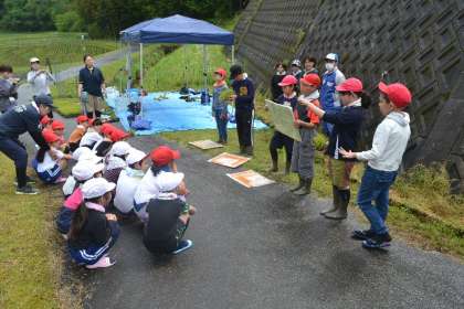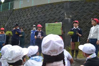 1・2年生が田んぼに到着したら、5年生が田植えの意義と方法を説明しました。小さな1・2年生も真剣に話を聞き、興味津々で質問する場面が見られました。