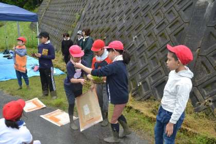 田植えを初めて行う1年生は、わからないことだらけです。1年生の挙手・質問を受けた5年生は、言葉だけでなく身振り手振りを使って丁寧に答えながら、田植えの方法を伝えていきました。