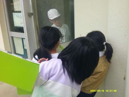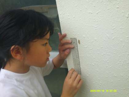 のびのびタイムに、3年生が理科でさなぎの観察をしていました。上の運動場への出入り口の外壁にさなぎが1匹張り付いています。
