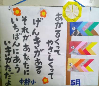 5月に入って、貸出カウンターの掲示物が変わりました。居場所のスタッフの方の作品です。折り紙の鯉のぼりがとても可愛いです。いつものことながら、言葉にも励まされます。