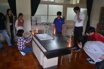 次に、火をつけたろうそくを用いて、底なしの集気びんと集気びんの蓋を使いながら、異なる条件で燃焼の様子を比較する実験を実施しました。それぞれの条件のもとで、ろうそくの灯がどのように変化するのかを観察し、その結果をもとに考察を進めました。
