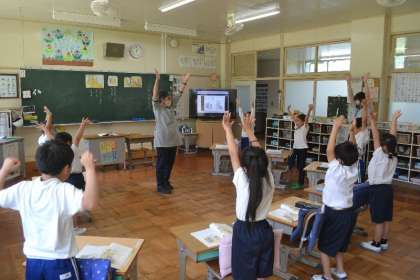 1年生の国語の授業で、「とん こと とん」の学習が進んでいます。この教材を通して、子どもたちは言葉のリズムや表現のおもしろさを学びながら、体全体を使って楽しんでいます。