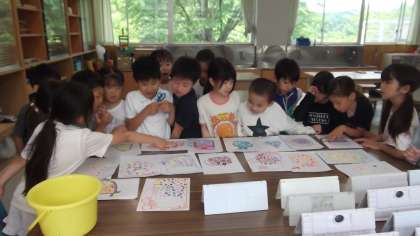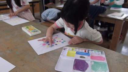 水彩絵の具の優しい色合いと、指を使った自由な表現で、一人一人の個性が光る作品が完成しました。子どもたちの創造力が広がる、楽しい授業となりました。