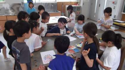 授業の終わりには、みんなで作品を並べて鑑賞し合う時間を設けました。「この色の混ざり方がきれい!」「指でこすると、こんな模様ができるんだ!」と、子どもたち同士で気づいたことを伝え合いながら、さらに学びを深める様子が見られました。