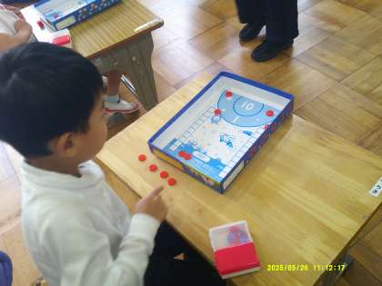 その後、おはじきを飛ばしの遊びをする中で、「0」という数について考えていきました。おはじきが丸い枠の中にはいらなかったら0点です。何回もおはじきをはじいても全然入らない子もいました。遊びを通して、楽しく学んでいます。