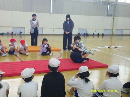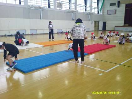 体育館でマット遊びです。両手をついて後頭部をマットに付けて前にくるんと回ります。2つ横に並べたマットをくるんくるんと何回も回っていきます。