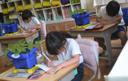 1年生の子どもたちが、生活科の授業でアサガオの観察をしました。本葉が増え始め、ぐんぐんと成長していく様子を、じっくりと見つめながらスケッチしました。