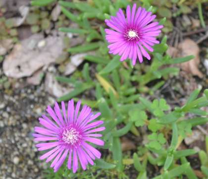 マツバギクは、鮮やかなピンクや紫の花を咲かせ、陽の光を浴びながら輝くように見えます。その力強い美しさと生命力は、どこか元気をもらえるような存在です。花壇の一角に広がるその光景は、まるで小さな宝石がちりばめられているかのよう。
