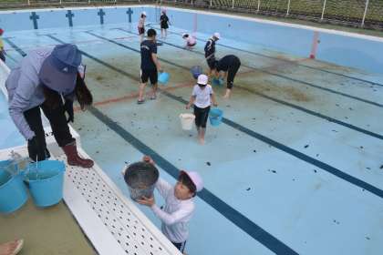 排水の進み具合を見て、時間内に終わらないかもしれないと判断すると、自然と子どもたちの間でバケツリレーが始まりました。一人一人が協力しながら水を運び、最後まで諦めずに掃除を進めた結果、見事に予定通りの時間内に掃除を終えることができました。