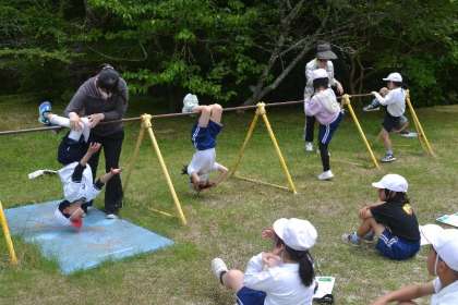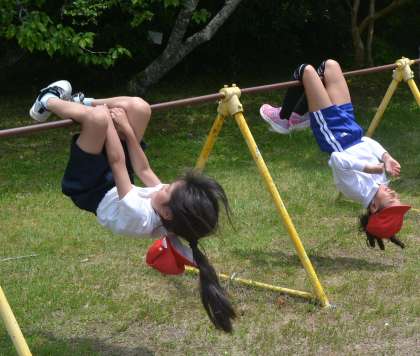 授業では、「布団干し」「ナマケモノ」「ダンゴムシ」「コウモリ」など、様々な技を体験。まずは鉄棒にしっかりとつかまり、腕や足を使って体をコントロールする感覚を身につけました。児童たちは、技の名前を聞くたびに「どんな動きかな?」と興味津々。実際に挑戦してみると、「ナマケモノみたいにのんびりぶら下がれる!」「ダンゴムシのポーズ、おもしろい!」と、楽しみながら運動能力を伸ばしていきました。