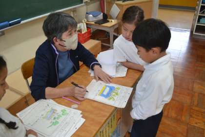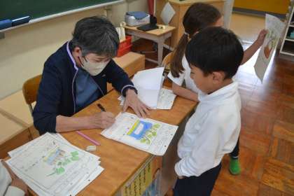 観察レポートを担任に提出すると、担任はていねいに朱書きをしながら、子ども一人一人と対話を重ねます。「この葉っぱの形に気づいたのはすばらしいね」「色の変化をしっかり観察できているね」と、子どもたちが持つ視点をほめて伸ばしていきます。