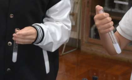 まず、二酸化炭素を試験管に集め、石灰水を加えると、透明だった液体が白く濁りました。この現象を見た子どもたちは、前回の授業で学んだことを生かしつつ「やっぱり白くなるね」と、化学反応をイメージしながら理解を深めていました。