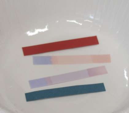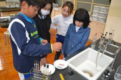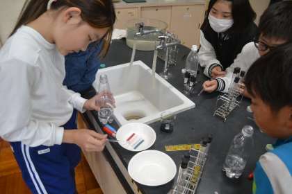 さらに、二酸化炭素が水に溶けると炭酸水になり、酸性を示す性質を、リトマス紙を使って検証しました。その中で、「青色になったよ」という気付きをもった子どもの声を受けて、教師が石灰水の性質「石灰水は、アルカリ性を示す」を説明。石灰水のアルカリ性の「青」と炭酸水の酸性の「赤」、リトマス紙の色の変化を確認しながら、酸性・アルカリ性の違いについても理解を深めました。