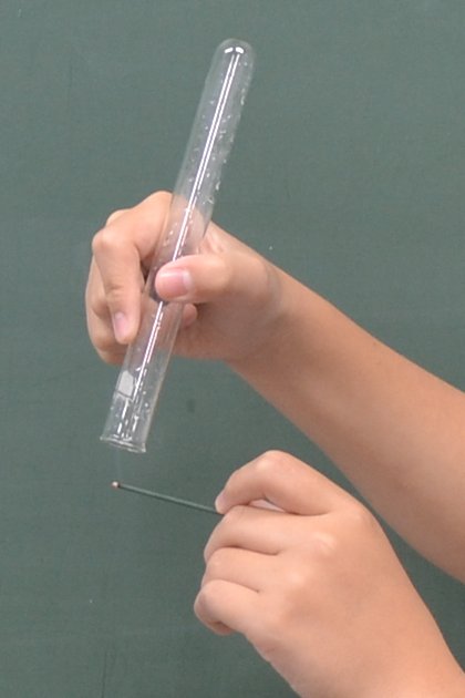また、二酸化炭素が燃焼を止める性質を確かめるため、試験管内に火のついた線香を入れたところ、すぐに火が消える様子を観察。「火がつかないのは酸素がないからだね」と、子どもたちの理解が広がっていきました。