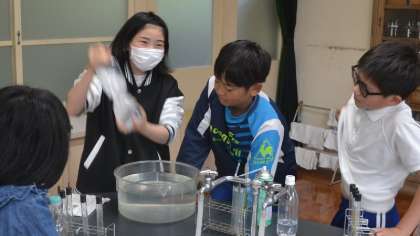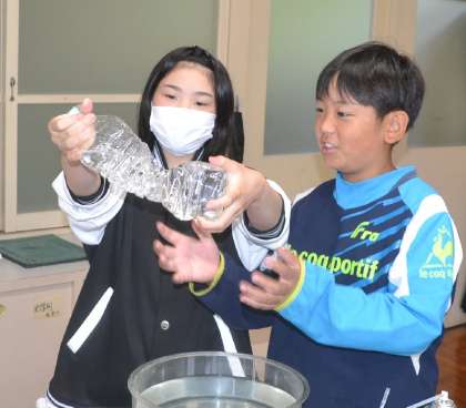 最後に、ペットボトルを使った実験にも挑戦。水に溶ける性質をもつ二酸化炭素によってペットボトルがつぶれ、そのペットボトルを水に入れると水位が増す様子を目の当たりにしました。