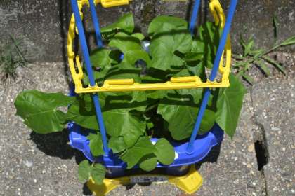 支柱に支えられながら、アサガオのつるはこれからどんどん伸びていきます。子どもたちは、「もっと大きくなってね!」と声をかけながらお世話を続けています。この体験を通じて、植物を育てる楽しさや大切さを学びながら、自然への興味も深めています。