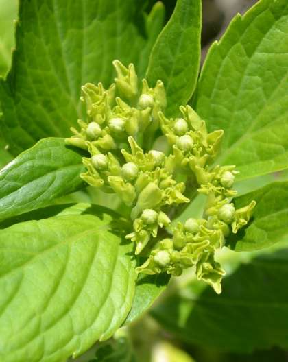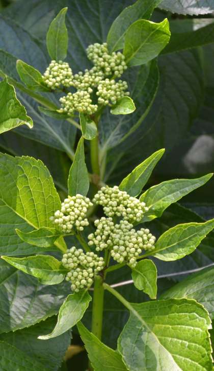 小原中部小学校の校庭では、アジサイがゆっくりと花を咲かせる準備を進めています。緑豊かな葉の間から、丸くふくらんできたつぼみが顔をのぞかせ、いよいよ色づく瞬間を迎えようとしています。