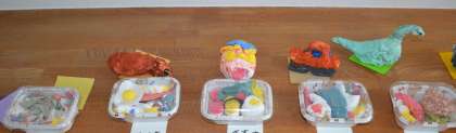 子どもたちは、それぞれの思いを込めて、色や形にこだわりながら作品を作り上げました。お弁当の作品には、お気に入りの食べ物がぎっしり詰め込まれ、動物やキャラクターの作品には、愛情たっぷりの表情が表現されています。