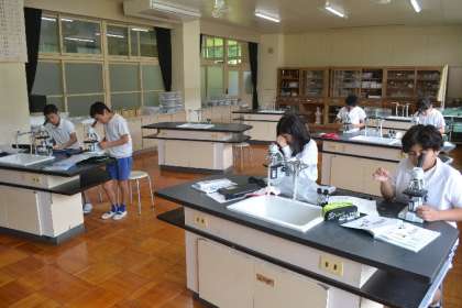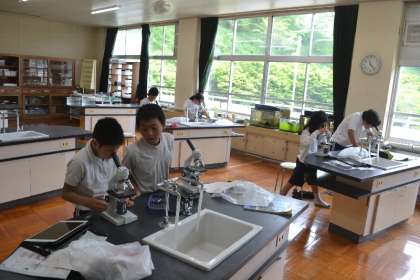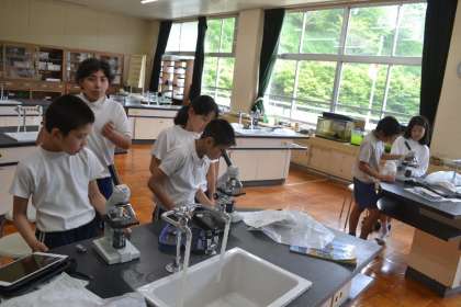 5年生の理科の授業で、メダカの食べ物となる「微生物」を調べるために、初めて顕微鏡を扱いました。一人一台の顕微鏡を手にした子どもたちは、期待と緊張が入り混じった表情で操作方法を確認しつつ観察を始めました。
