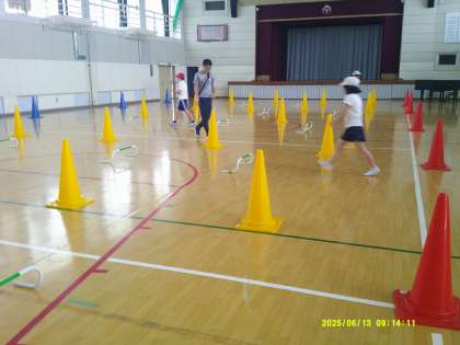 体育館で、カラーコーンなどを並べて、障害物競走のコースを作りました。玉杓子に小さいボールを入れたものを持って落とさないように走ります。