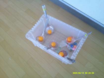 1年生から6年生までが楽しめるように、実際に競争をやってみて、考えていきます。玉杓子でなくて、スプーンにしたらどうか、などの意見もあり、さらに工夫していきます。
