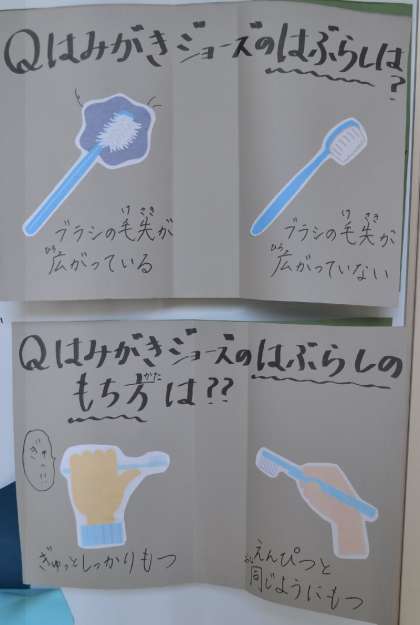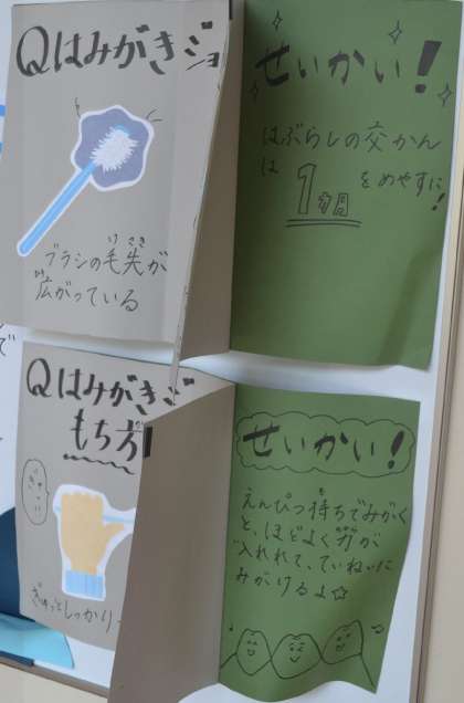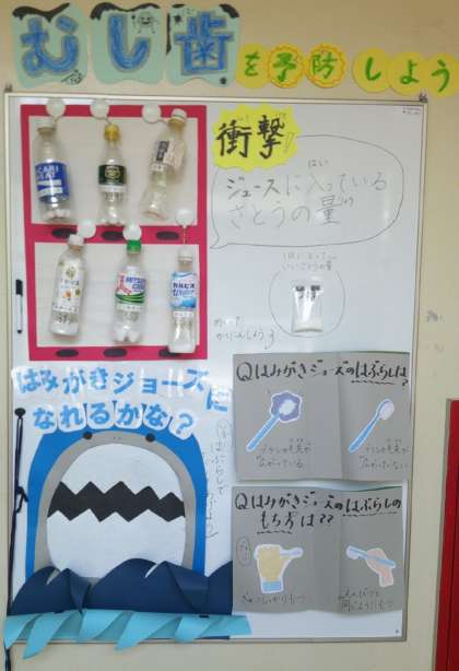 「はみがきジョーズになれるかな?」も工夫がされていて、ホワイトボート用のマーカーで歯の汚れを付けておいて、歯ブラシでこすると汚れが取れるようになっています。子ども達が楽しそうに挑戦しています。