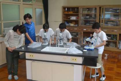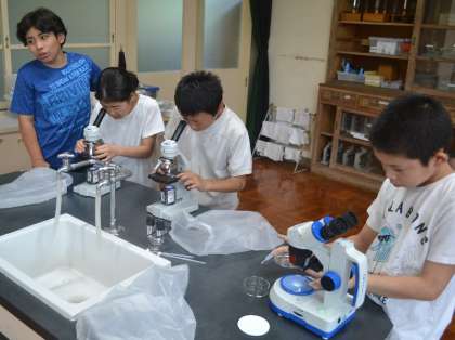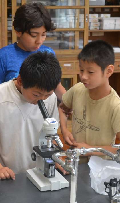 レボルバーを回し、40倍から100倍のミクロの世界へ。子どもたちは、熱心に観察を続けました。