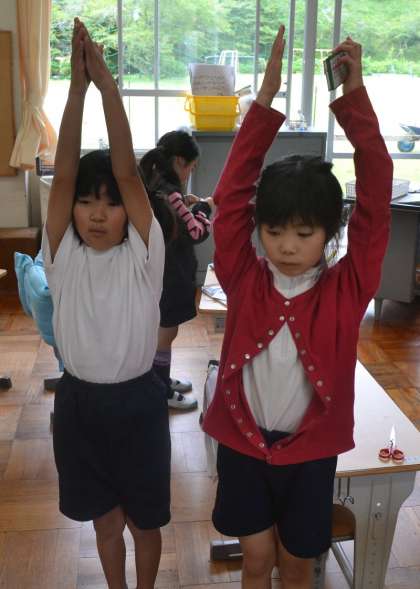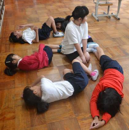 地図記号を覚えるために「地図記号かるた」を作成したり、仲間と協力して「人文字」で地図記号を表現するチャレンジを行ったりしています。「温泉の記号はどうやってつくる?」「田や畑は簡単にできるよ!」と、相談しながら体を動かして形をつくることで、地図記号の特徴をより深くとらえていきます。